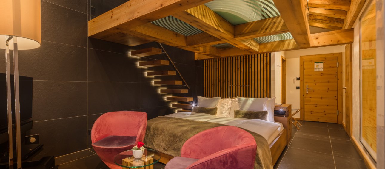 Sky Room (32sqm) with a balcony to the south side and seats, and a breath-taking Matterhorn view.