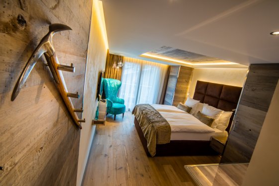 Premium Chic Room (26 m2) avec un balcon orienté nord et sièges, sans vue sur le Cervin. Ces chambres sont d’un luxe discret avec une touche de…