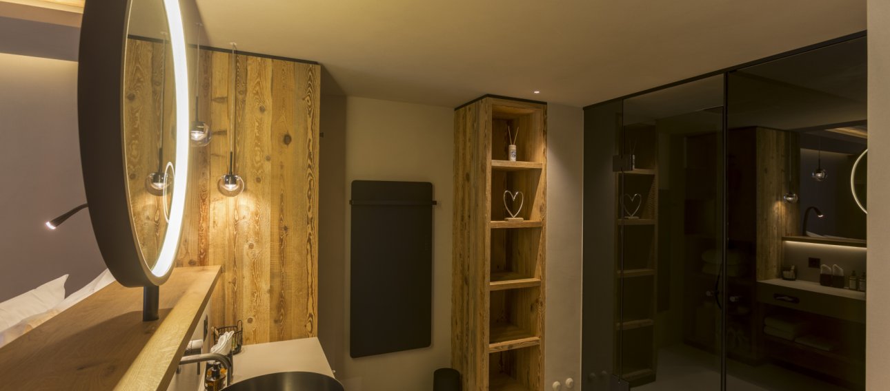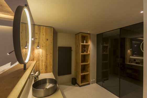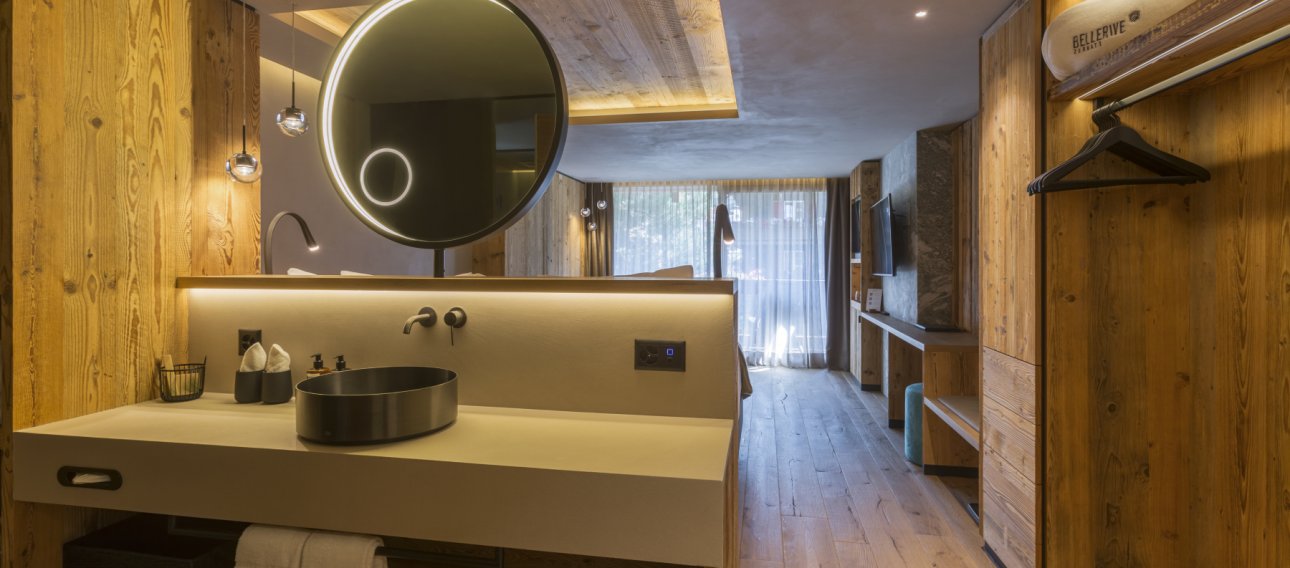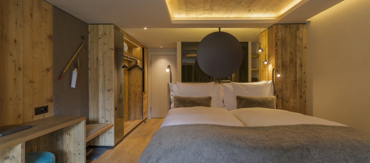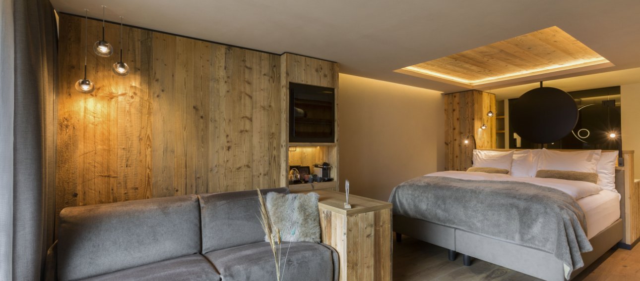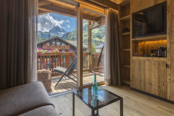Deluxe Room (32 m²) avec un balcon orienté sud et sièges, sans vue sur le Cervin. Les chambres Deluxe nouvellement aménagées sont é…