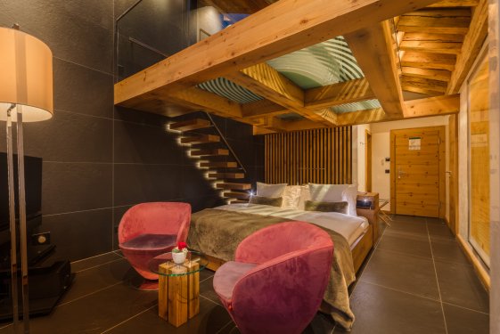 Sky Room (32 m²) avec un balcon orienté sud et sièges, et magnifique vue sur le Cervin. Cette chambre est moderne avec un lit king-size (1x180) et…